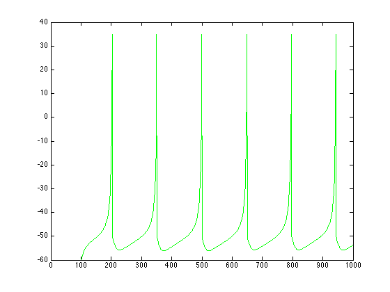 % parametres du modele C=100; vr=-60; vt=-40; k=0.7; a=0.03; b=-2; c=-50; d=100; vpeak=35; % parametres d'integration T=1000; dt=1; n=round(T/dt); v=vr*ones(1,n); u=0*v; I=[zeros(1,0.1*n),70*ones(1,0.9*n)]; % boucle principale: methode d'Euler for i=1:n-1 % Integre (etape Euler) v(i+1) = v(i) + dt * (k*(v(i)-vr)*(v(i)-vt)-u(i)+I(i))/C; u(i+1) = u(i) + dt * a*(b*(v(i)-vr)-u(i)); % Tire (reinitialisation) if v(i+1) >= vpeak v(i) = vpeak; v(i+1) = c; u(i+1) = u(i+1)+d; end end plot(dt*(1:n),v,'g');
