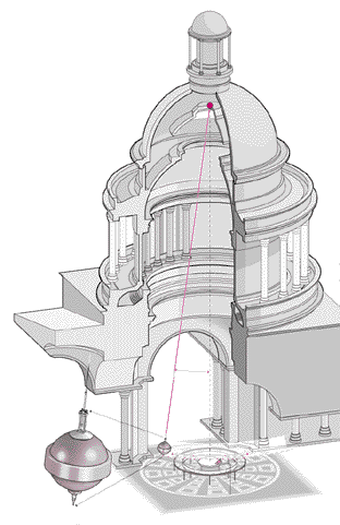 cette répartition de masses. Bien souvent pour tester la validité de la relativité générale, comme par exemple pour étudier l'avance du périhélie de Mercure ou encore la déviation des rayons lumineux rasant le Soleil, on prend l'espace vide et plat de Minkowski comme modèle d'univers, et cela est suffisant. Mais il existe une expérience qui teste la validité de l'existence des conditions aux limites c'est celle trop souvent incomprise du Pendule de Foucault. Moins connu est le fait que Léon Foucault récidivait l'année suivante (en1852), en se débarrassant du problème de la latitude et en expérimentant avec un gyroscope ! Le pendule de Foucault |