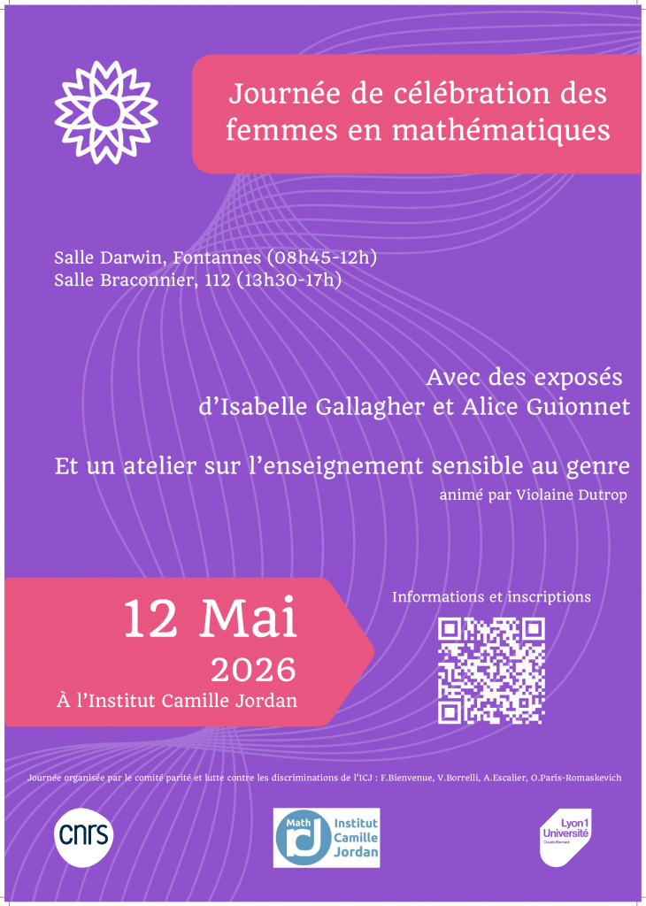 Cette journée est organisée par le comité Parité, égalité, lutte contre les discriminations de l’Institut Camille Jordan. Elle est ouverte à toutes et tous. Merci de remplir ce formulaire pour vous inscrire au repas et/ou à l’atelier sur l’enseignement sensible au genre et de nous écrire si vous souhaitez proposer une idée pour la brocante mathématique.