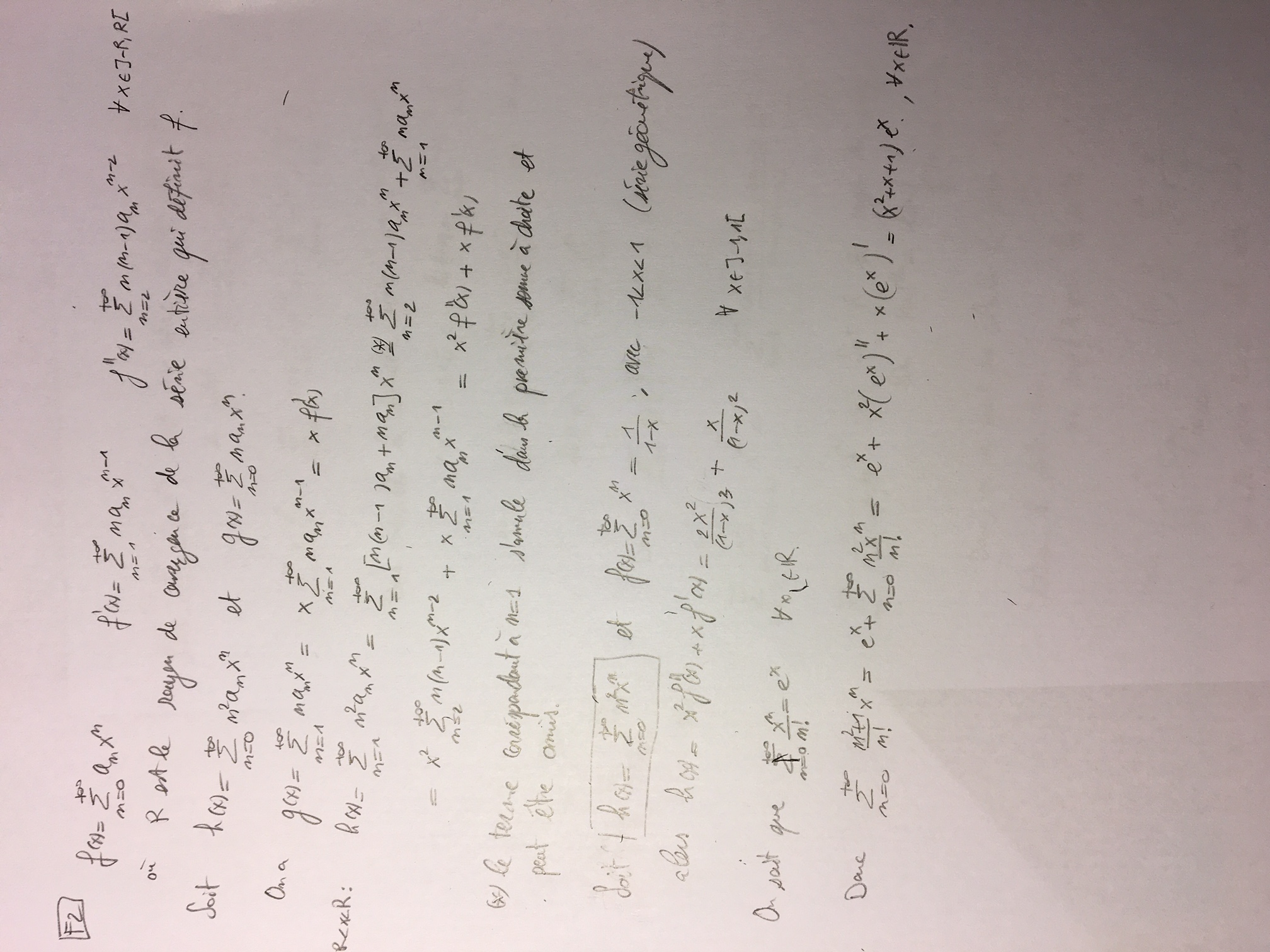 Nous étions allés au delà de l'énoncé et nous avions écrit la fonction exponentielle et la fonction logarithme comme la somme d'une série de fonctions bien précises. Vous avez là déjà deux exemples de séries entières.
