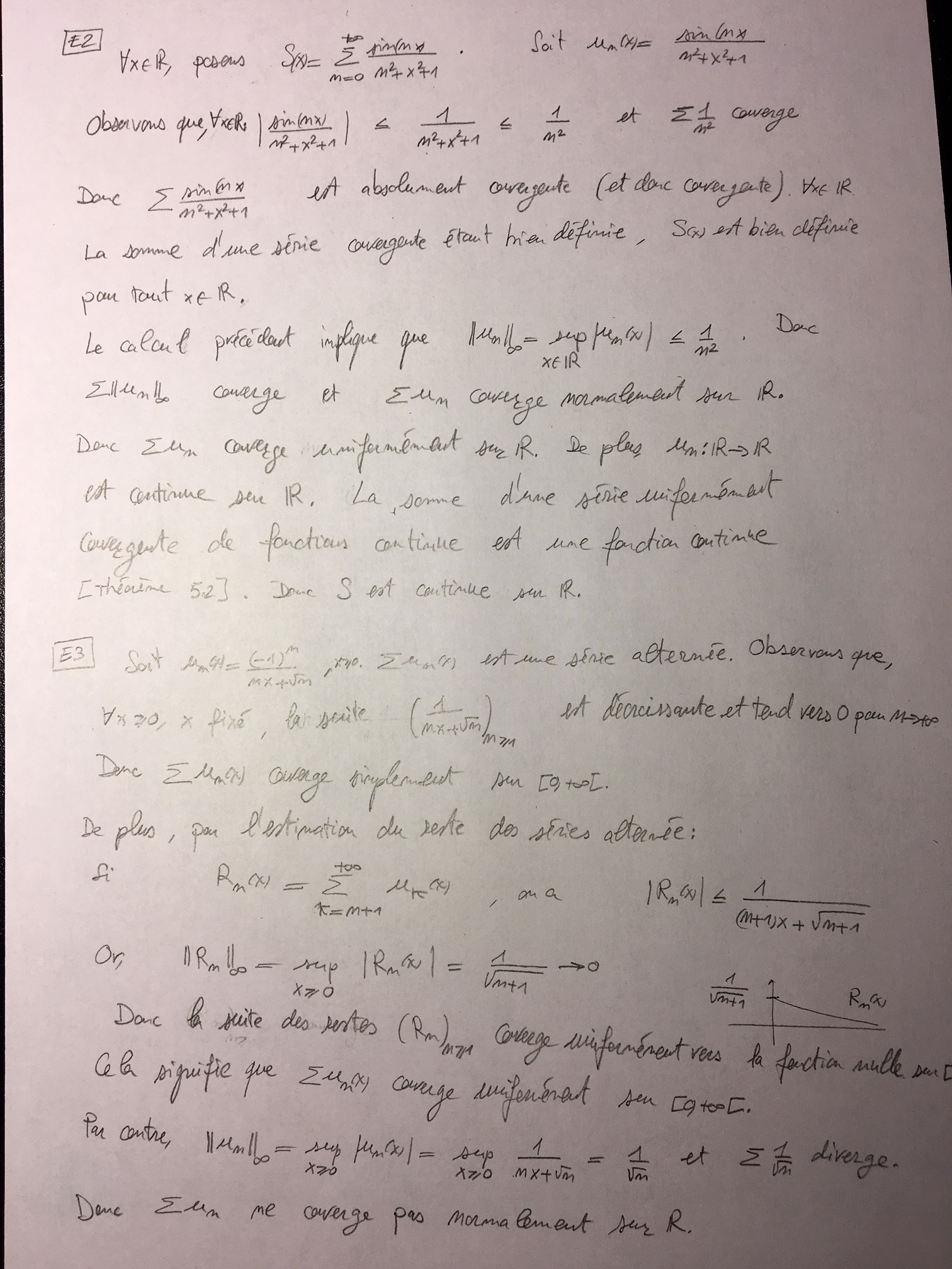 traiter, au choix, l'exercice E3 ou E4 (Indication : Pour démontrer que la série est uniformément convergente, ici il convient d'utiliser le théorème des séries alternées (notamment l'estimation du reste) et démontrer que la suite des restes de la série converge uniformément vers la fonction nulle).