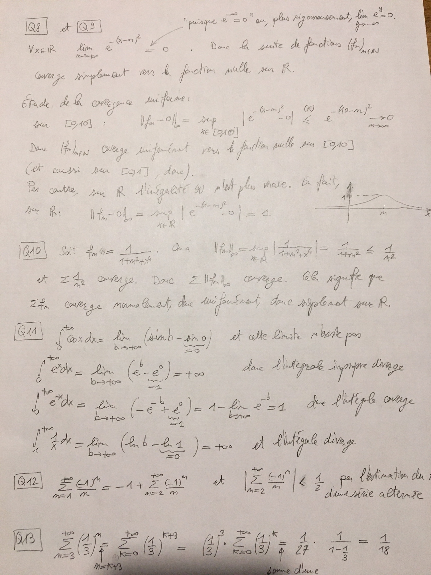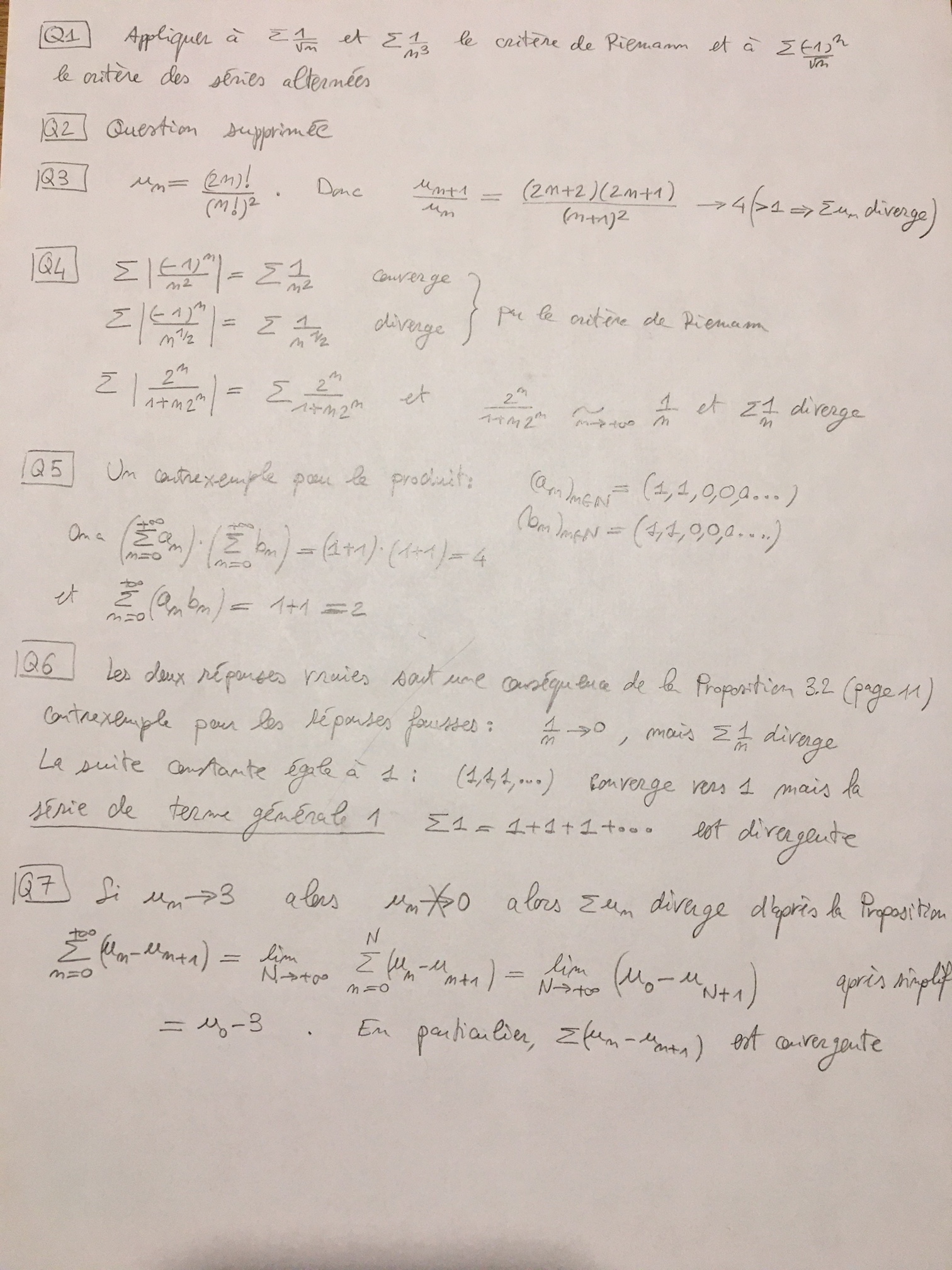 J'insiste sur l'importance des questions 1 (=savoir appliquer les critères basiques de convergence d'une série), 6 (=bien comprendre la différence entre “la suite u_n converge” et “la série de u_n converge”), 7(=savoir manipuler une somme téléscopique) et 13 (=reconnaitre une série géométrique et en savoir calculer la somme).