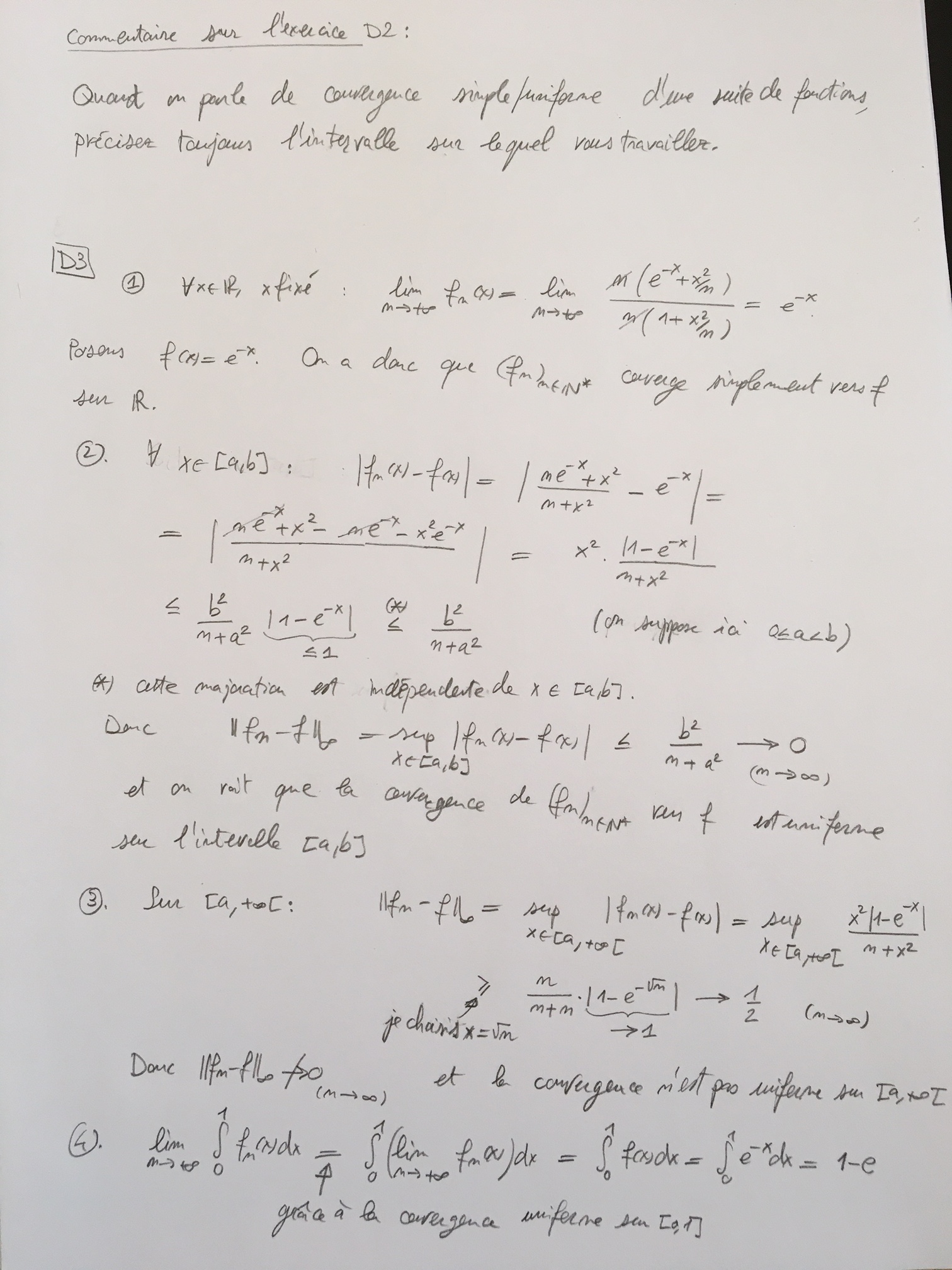 traiter l'exercice E1 (Indication : essayer de démontrer que sur l'intervalle plus gros, il y a convergence simple, mais pas convergence normale, de la série de fonctions. Montrer ensuite que sur l'intervalle plus petit il y a convergence simple ET convergence normale de la série de fonctions).